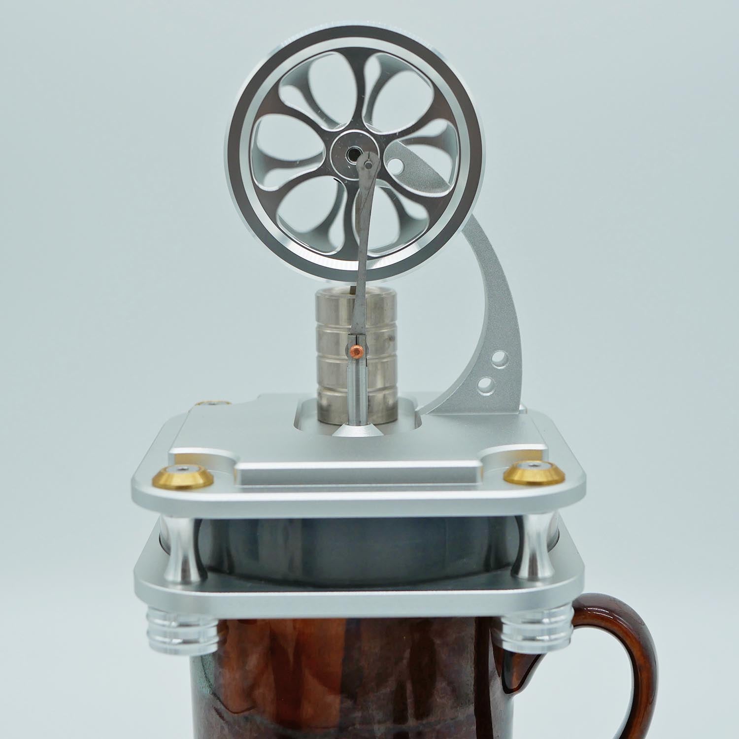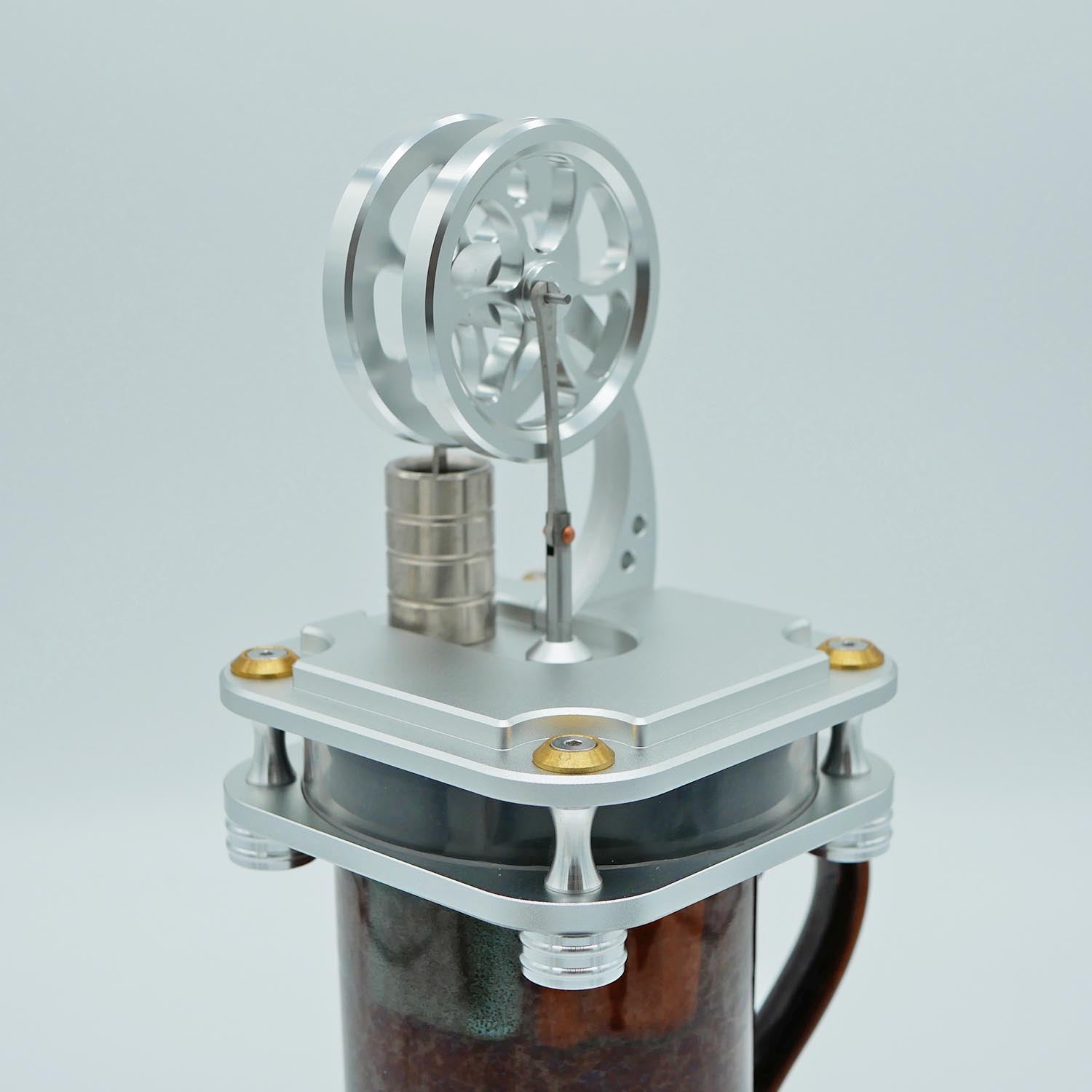 This elegant device brings the principle of the Stirling cycle to your tabletop, creating a captivating spectacle as it transforms the heat of your coffee into kinetic energy. This amazing engine will run on any hot liquid and fits perfectly over your favorite mug.