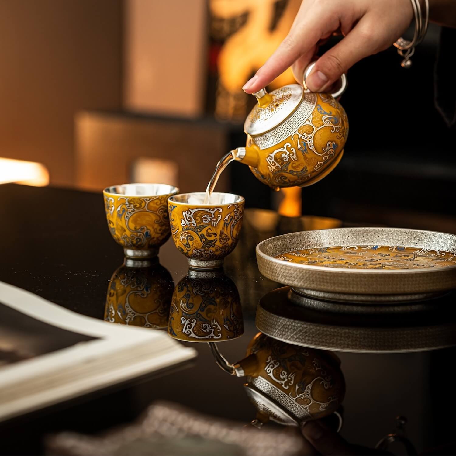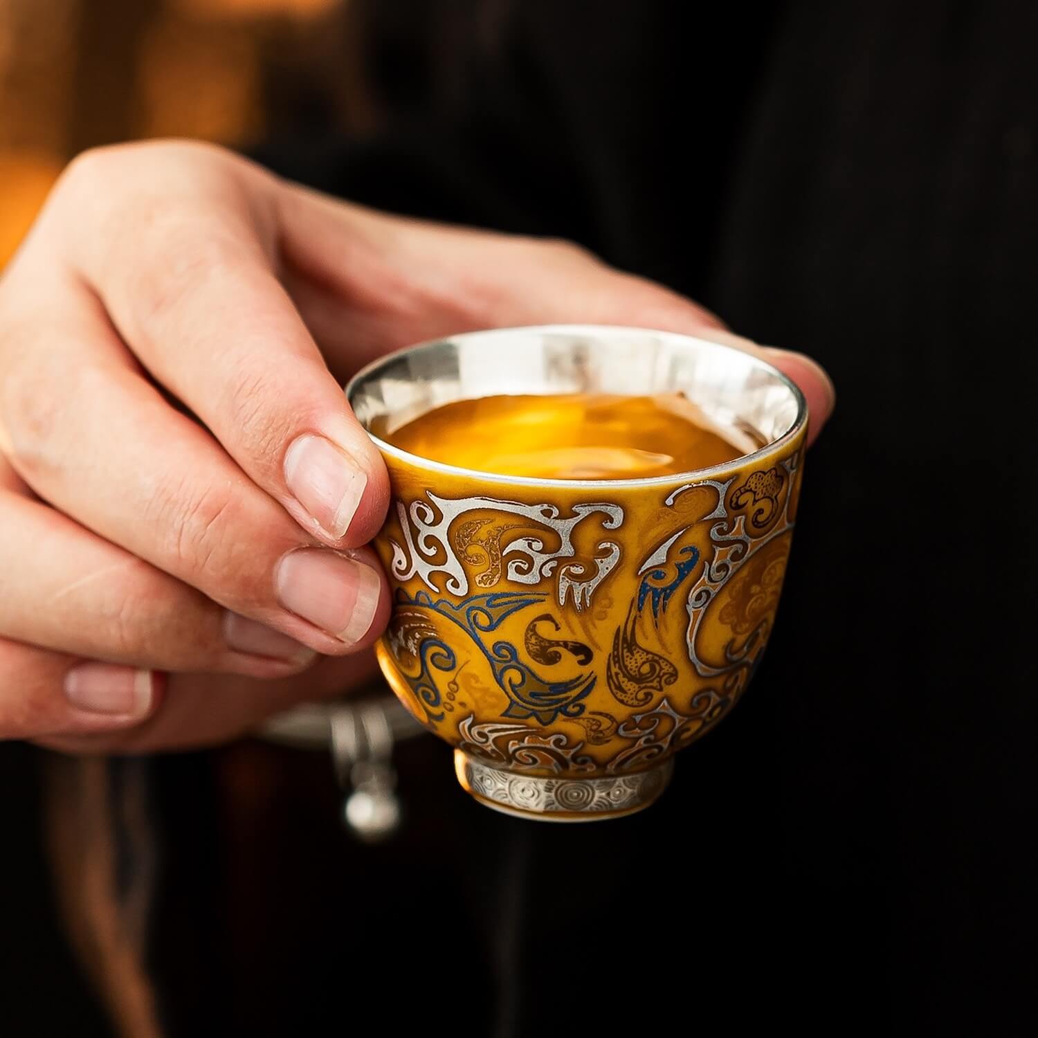 Set it on your desk with a slow-brew tea, or pour a late-night whisky under warm light — the silver interior captures every reflection, while the golden glaze radiates unmistakable prestige.