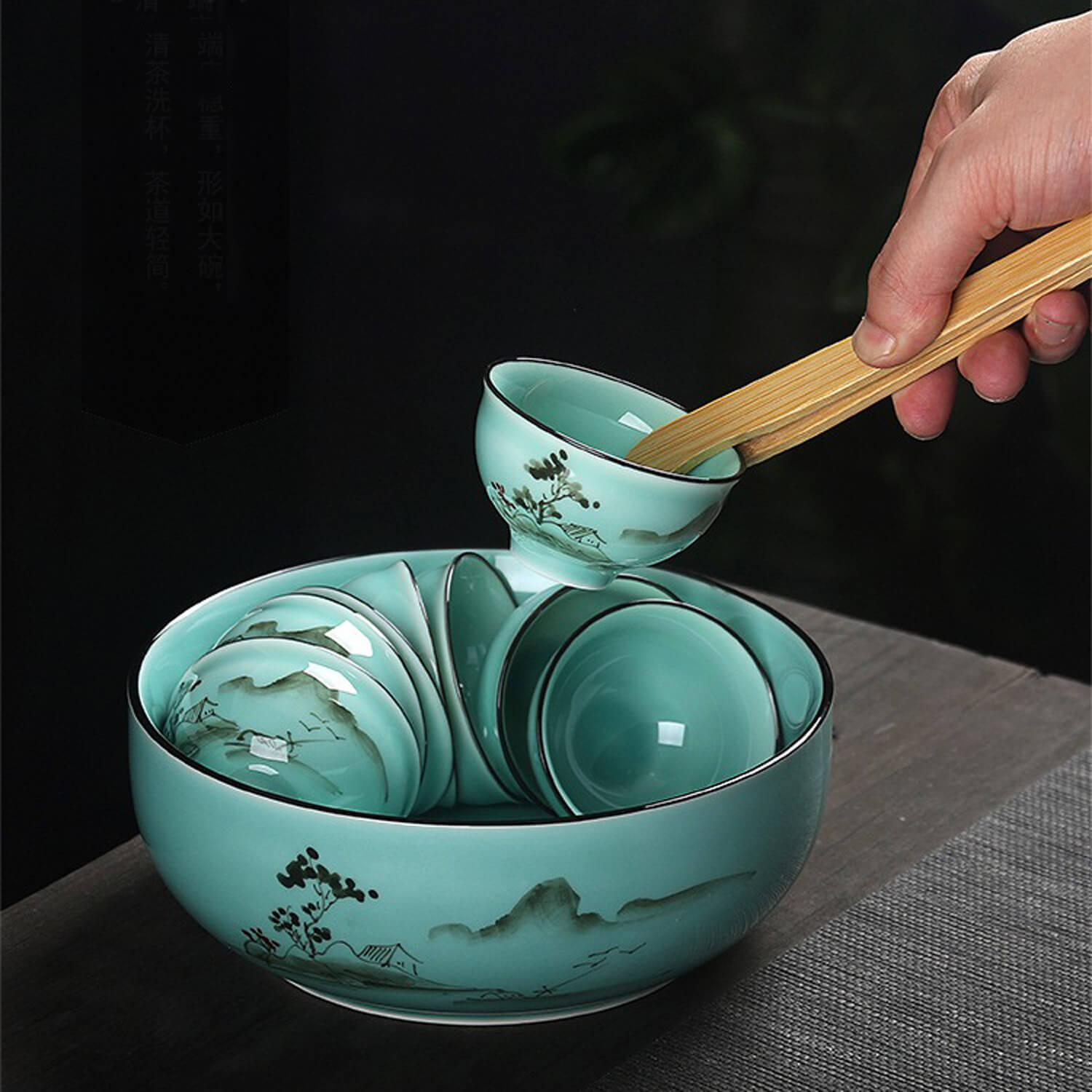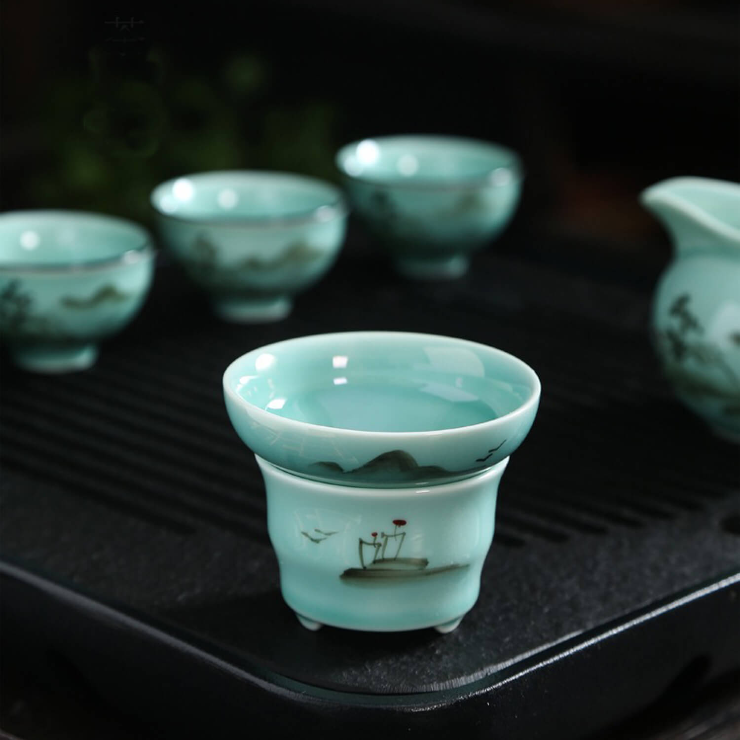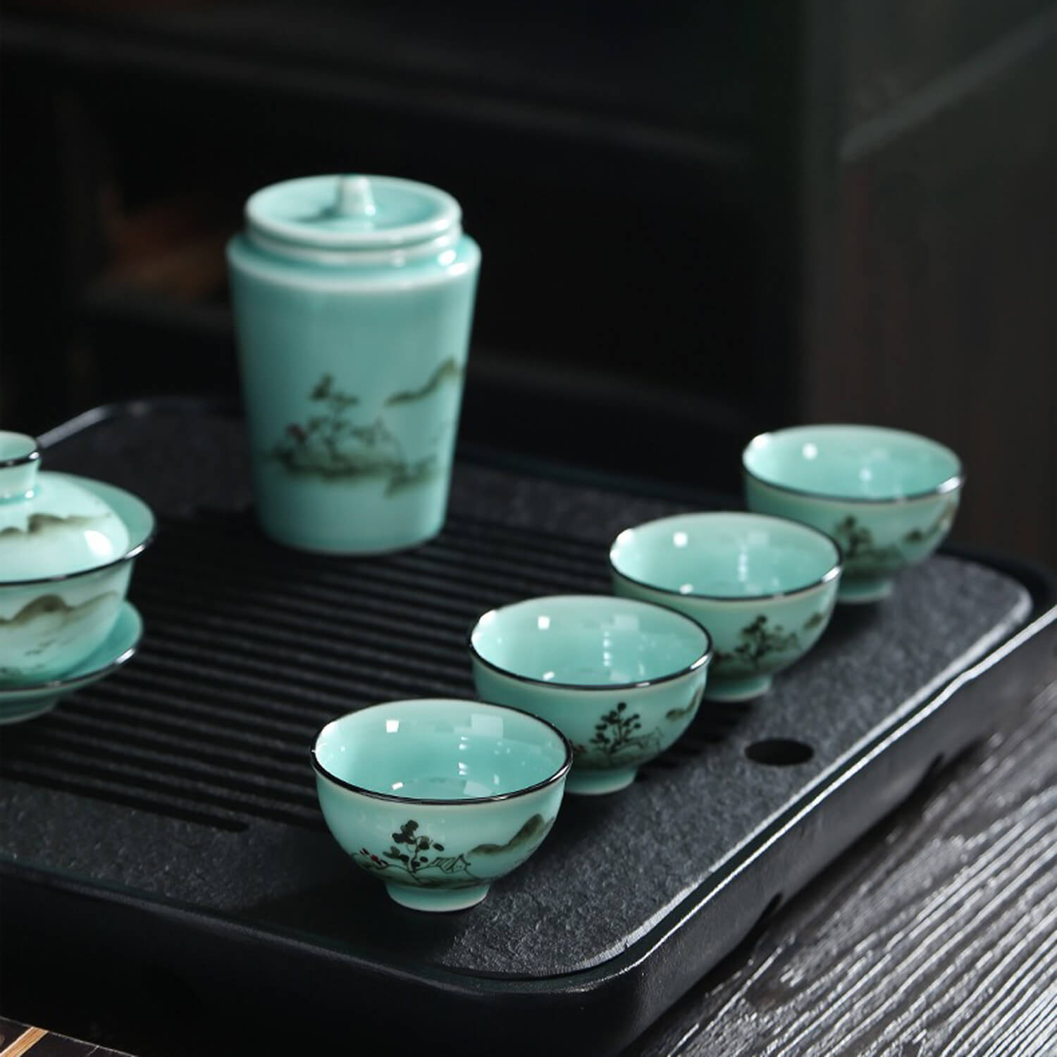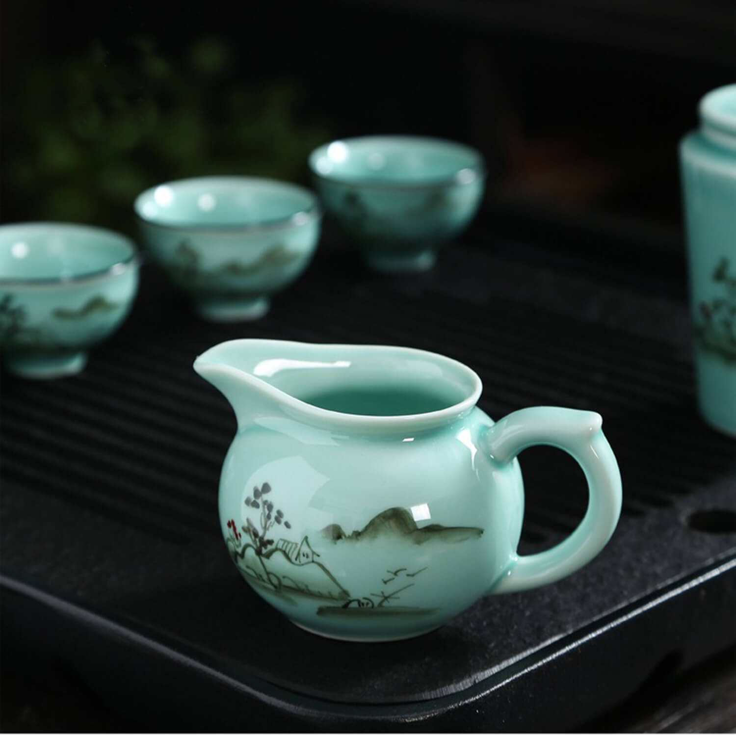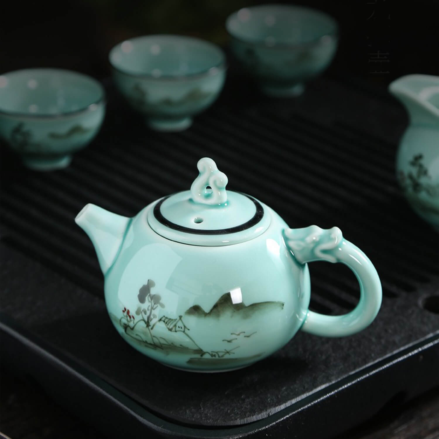 Experience the essence of traditional craftsmanship combined with modern design with our Elegant Hand-Painted Celadon Tea Set. This exquisite set, crafted from premium celadon and adorned with intricate hand-painted landscape motifs, offers a unique tea-drinking experience steeped in the beauty of oriental aesthetics.
