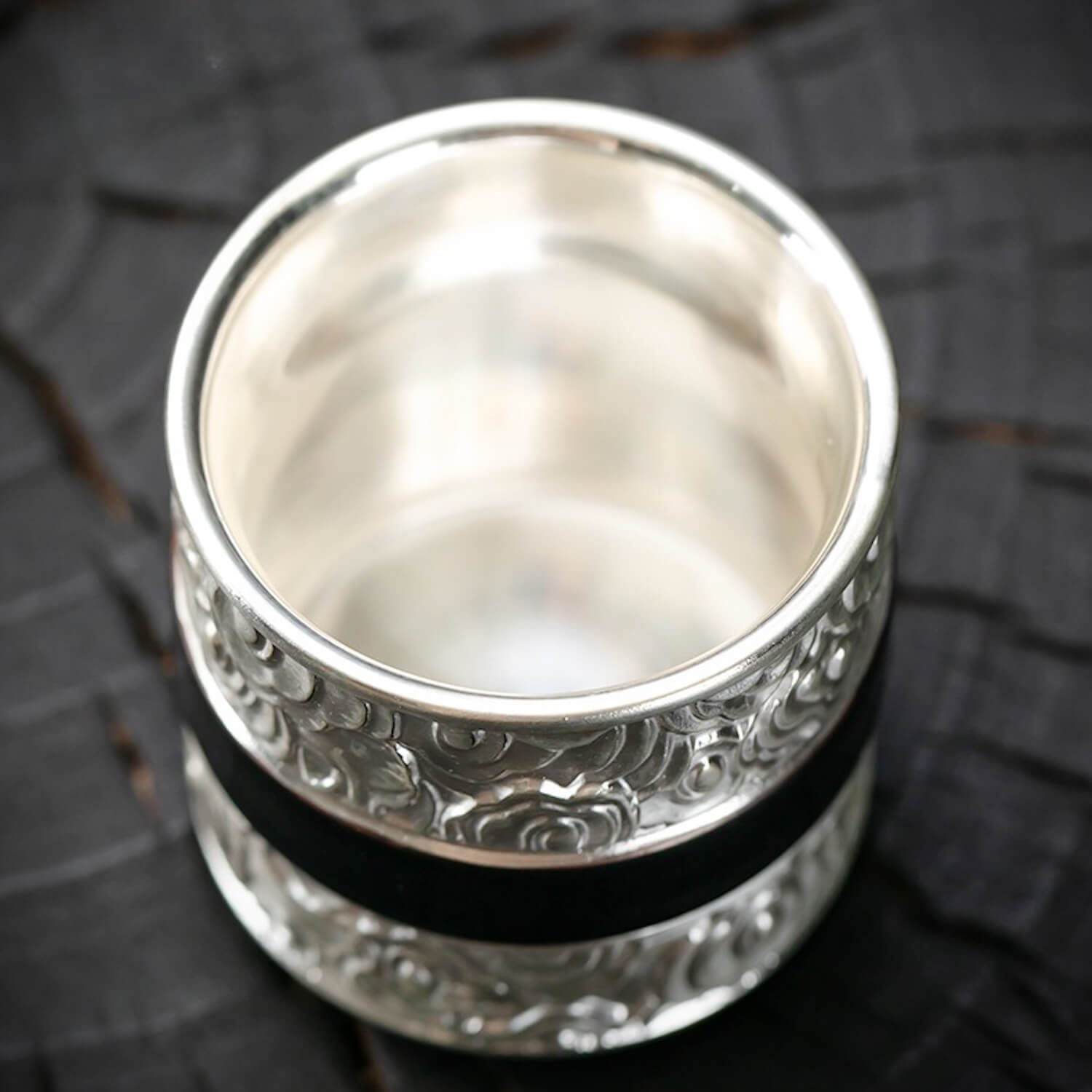 The Nocturne Silver-Lined Cup turns every sip into a ritual. Its silver interior reflects tea, sake, or whiskey with luminous clarity, making each drink glow like liquid light. The exterior layers combine embossed cloud motifs with a midnight-black glaze band, creating a striking contrast of texture and depth. Perfectly sized at 110ml, it balances elegance and function—ideal for gongfu tea, whiskey tastings, or espresso. The low, steady form rests confidently in the hand, while silver at the rim, smooth glaze, and sculpted relief offer a multi-sensory experience.