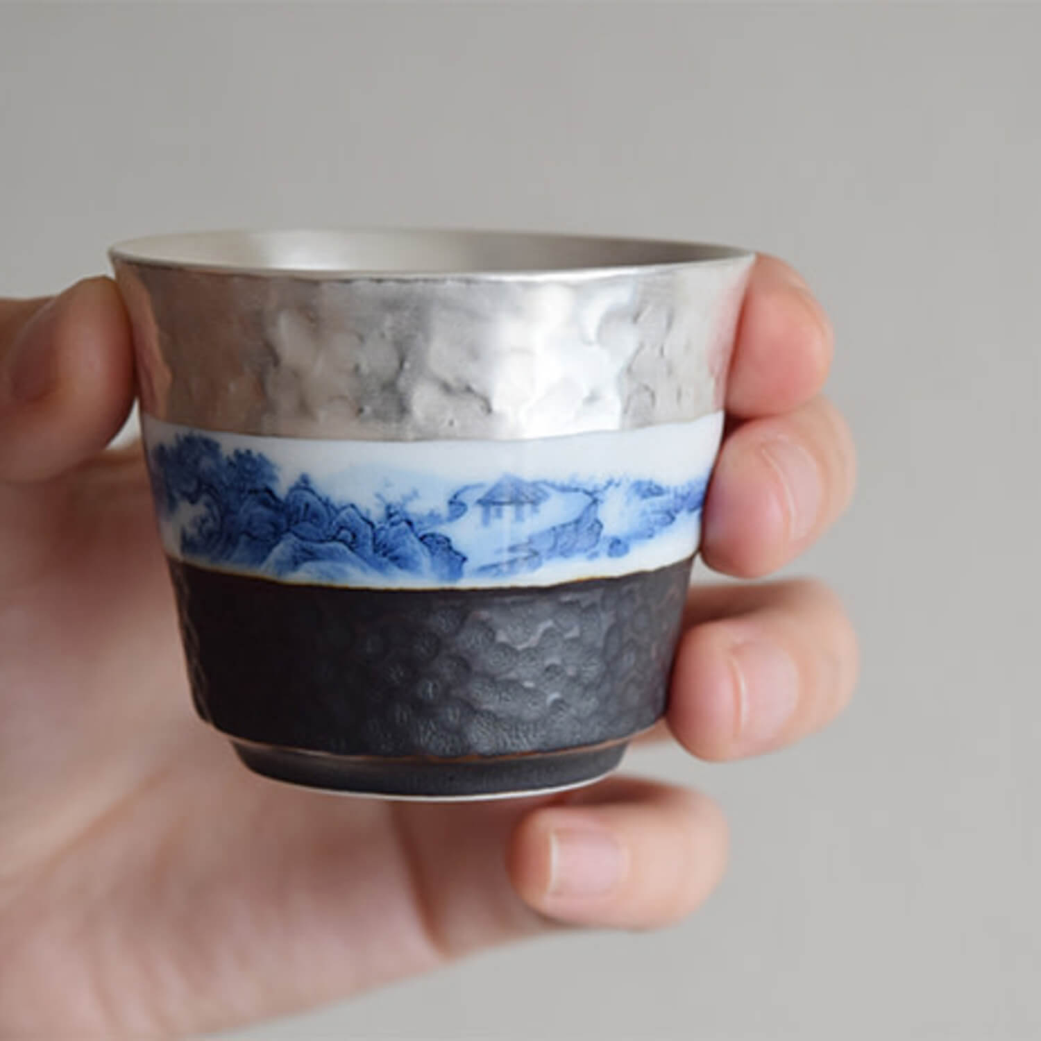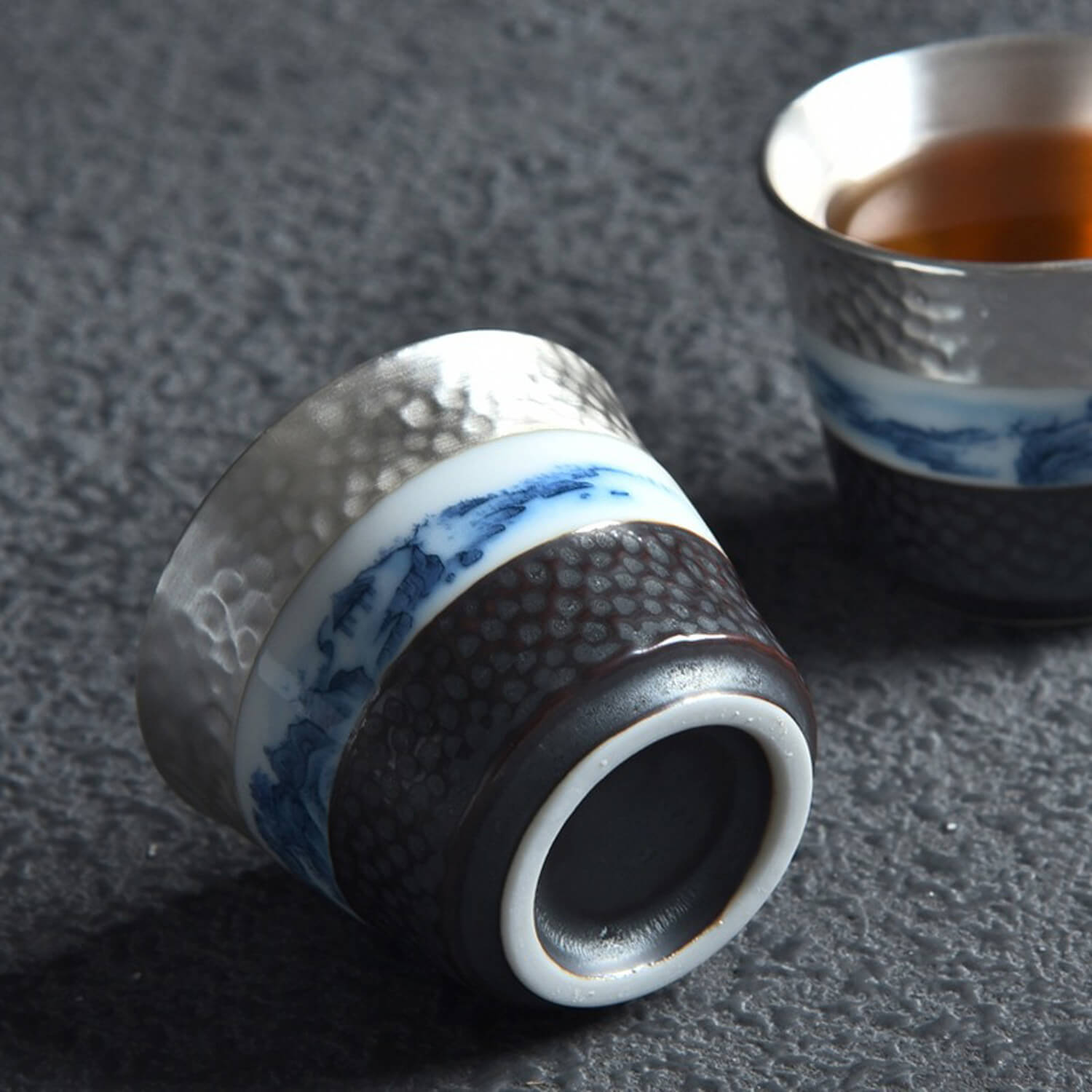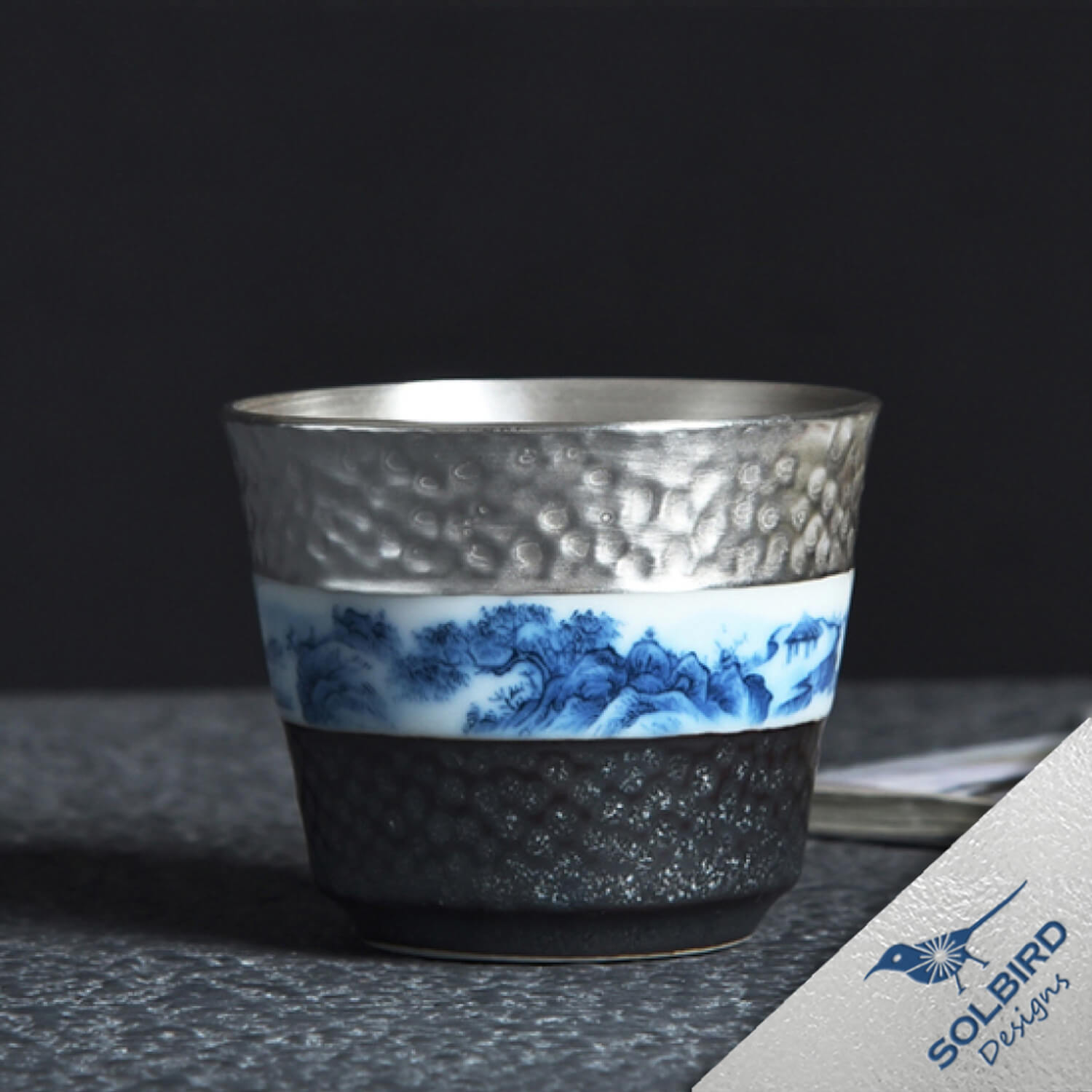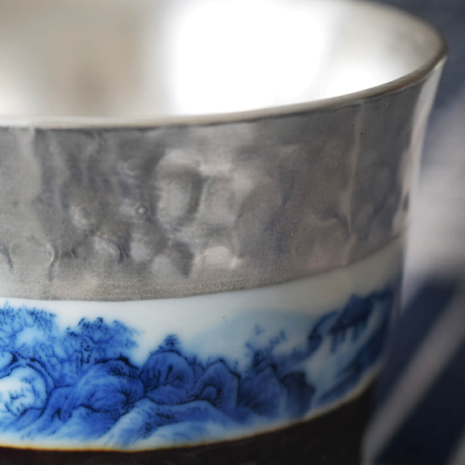 Amidst the silver and black, the cup reveals a serene narrative—a delicate landscape painting on porcelain. Each sip you take is a journey to a tranquil oasis, an escape from the world's chaos. The tactile delight of the hand-hammered silver at the top waits to be explored, adding a sensory layer to your tea sessions.
