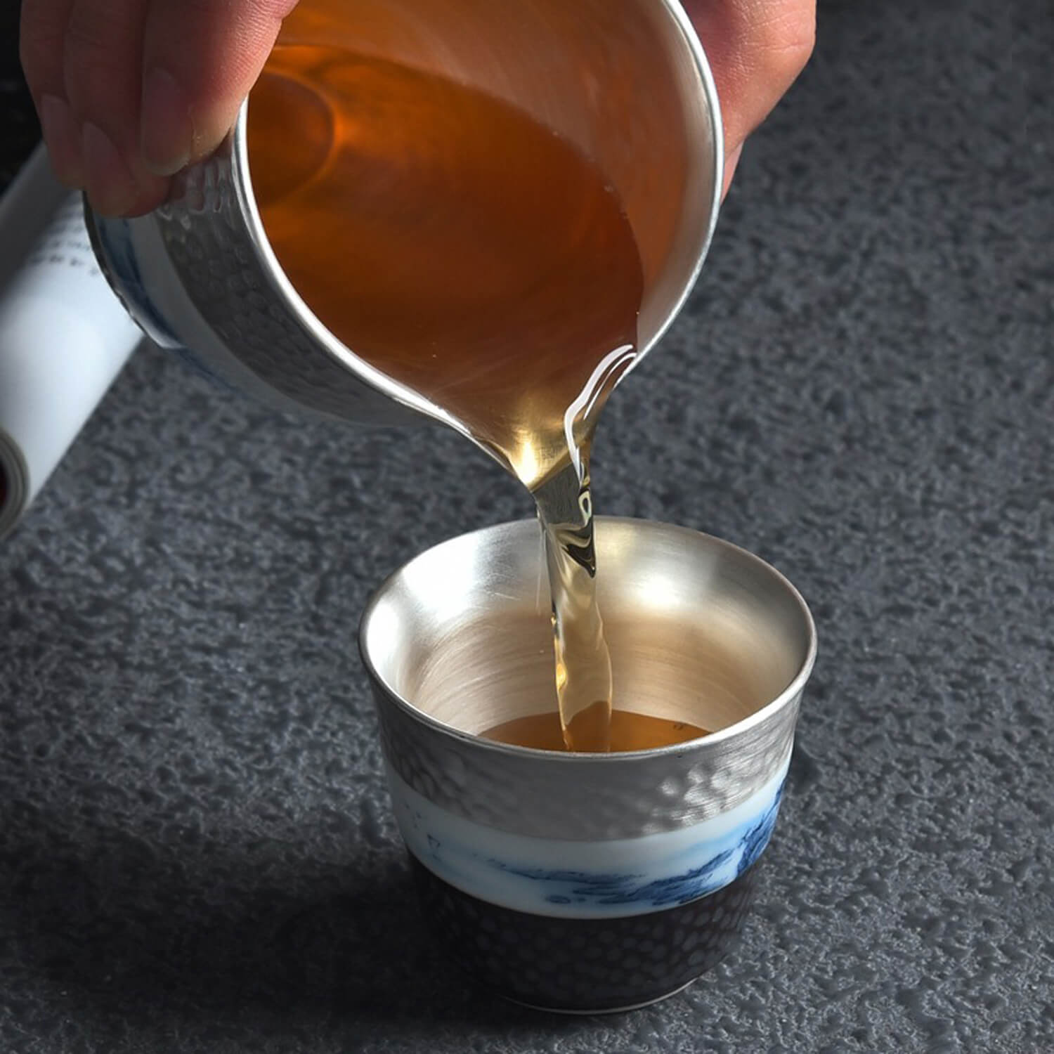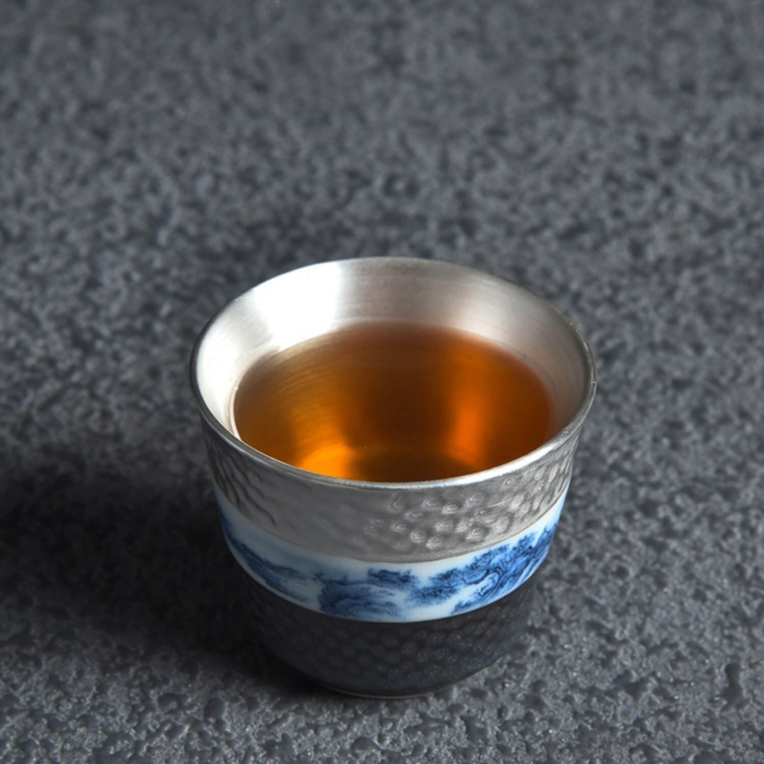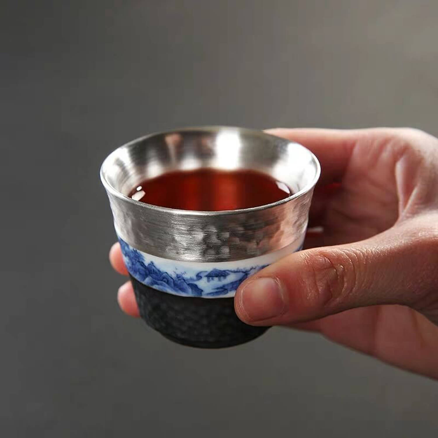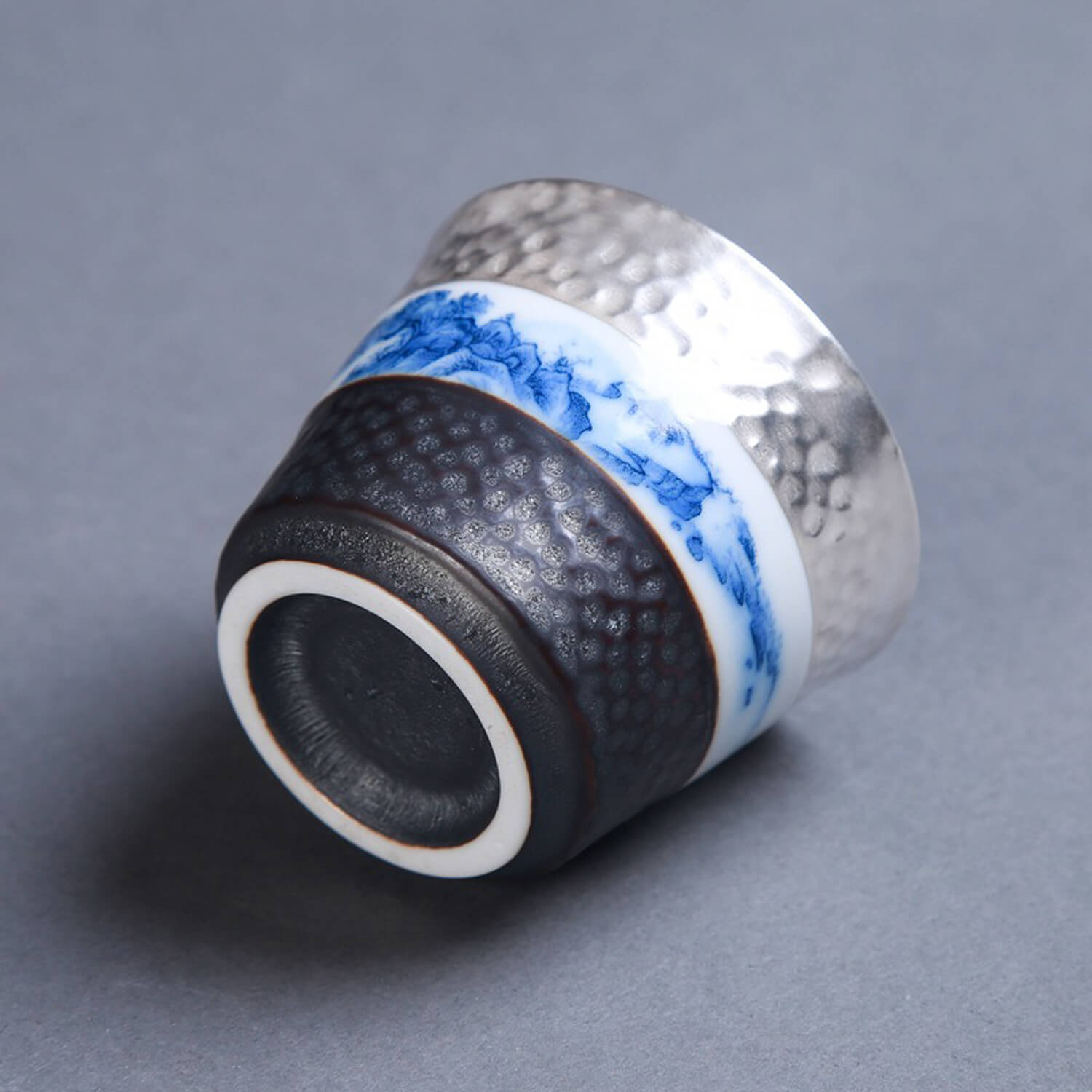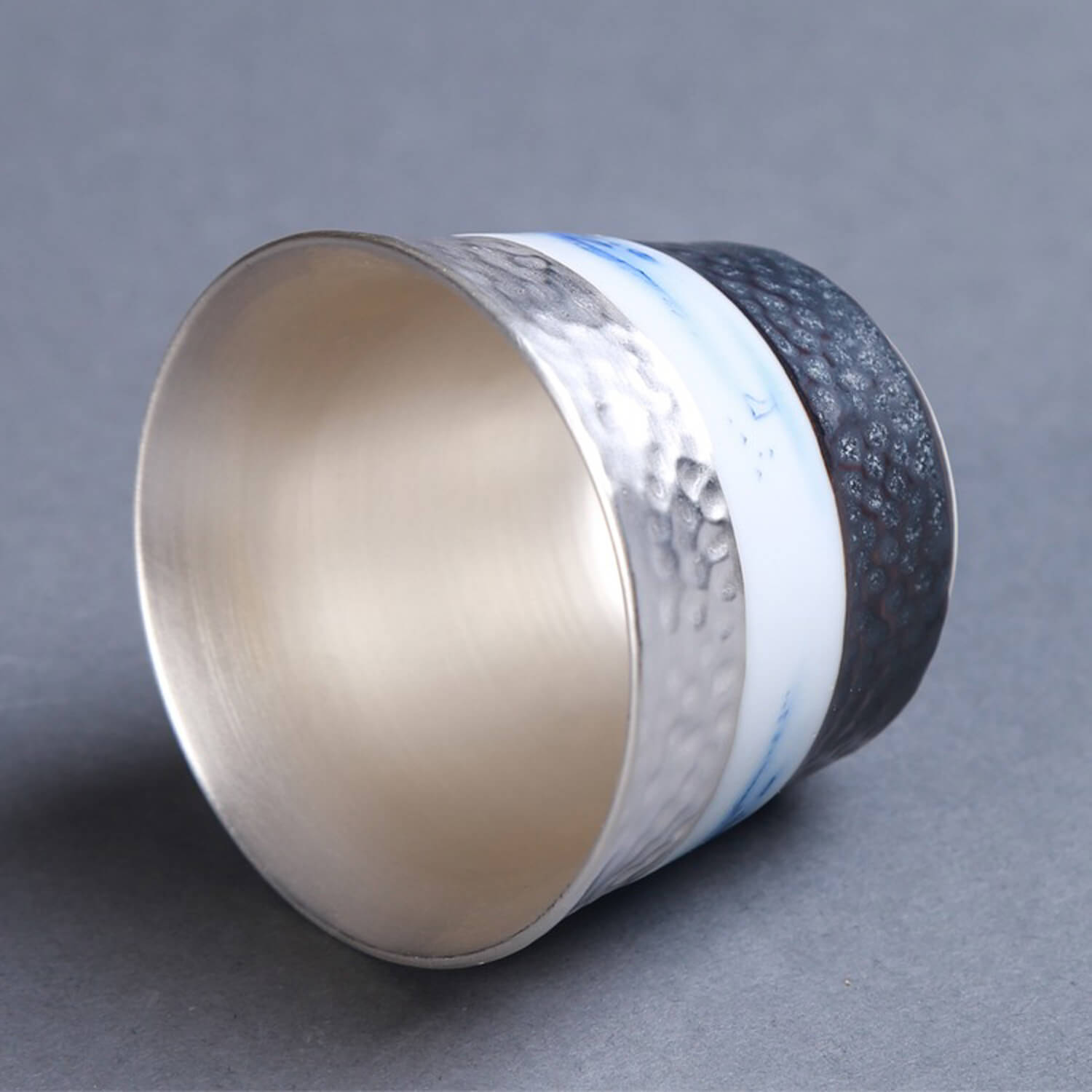 Amidst the silver and black, the cup reveals a serene narrative—a delicate landscape painting on porcelain. Each sip you take is a journey to a tranquil oasis, an escape from the world's chaos. The tactile delight of the hand-hammered silver at the top waits to be explored, adding a sensory layer to your tea sessions.
