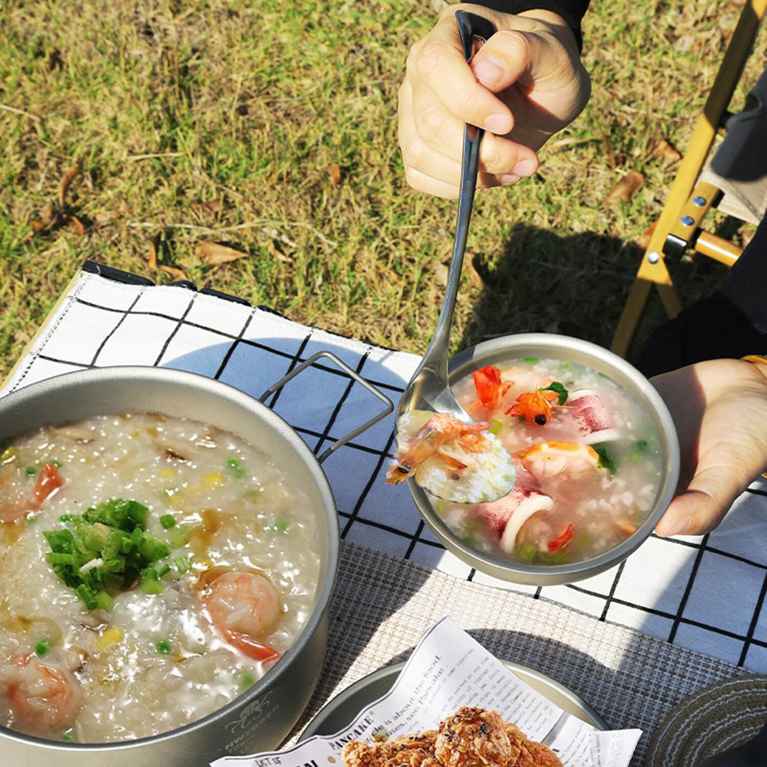 Stamping after a single piece of solid and thick pure Titanium, our Soup Spoon is elongated, deep style. Sturdy and elegant.
