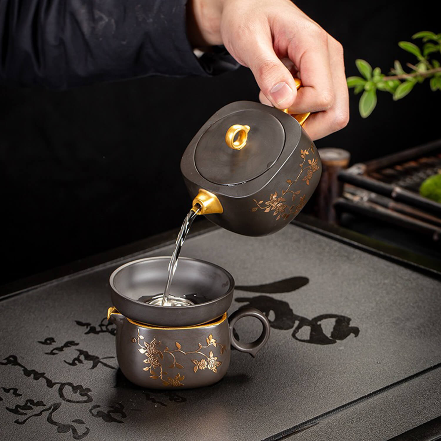 Transform your tea ritual with the finest materials, masterful craftsmanship, and a rich cultural legacy. This exquisite Yixing purple clay tea set, lined with pure 24k gold and adorned with hand-painted floral patterns, is designed for tea enthusiasts who appreciate both the art and functionality of traditional teaware.