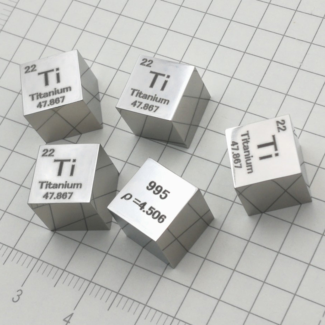 Each Titanium cube is solid and of high purity of 99.5%, highly polished by hand for many hours to reach a mirror finish, and laser engraved with its periodic info. This is an heirloom piece that will last forever.