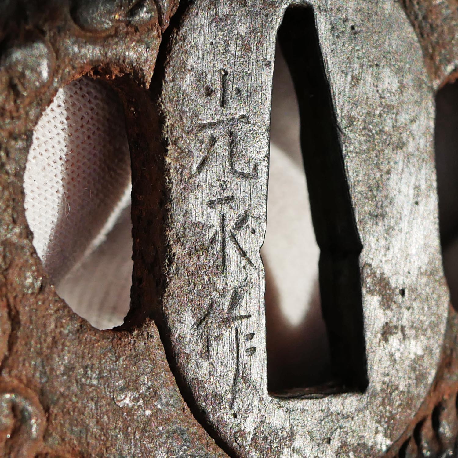 This stunning Tsuba has been forged by the celebrated tsubako (Tsuba craftsman) Koei Goto, known for his meticulous attention to detail and artistic prowess. Crafted from iron, a favored material of the period, this Tsuba echoes the strength and resilience of the samurais themselves.