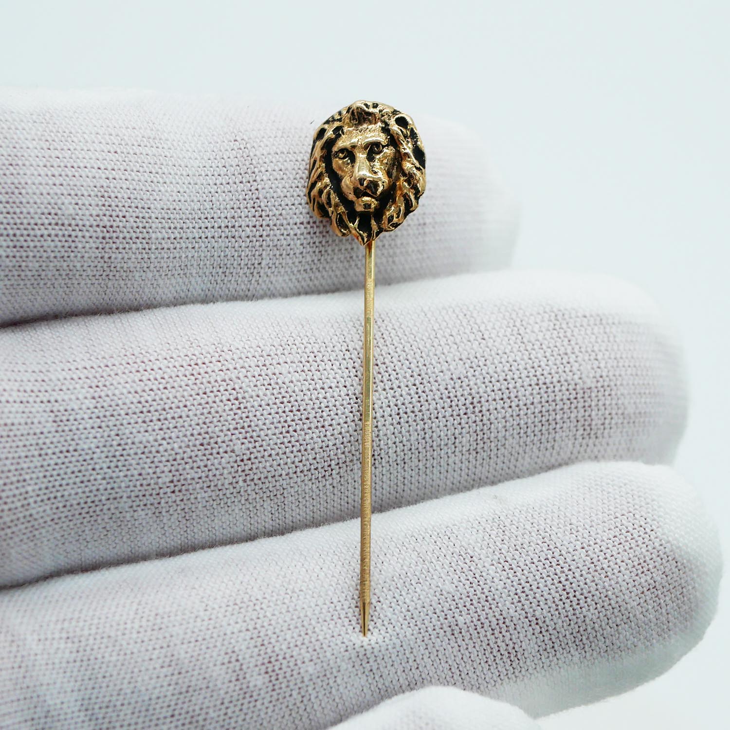 Made from solid 14k yellow gold, the lion head measures 13.5mm in length and 11.3mm in width, offering a strikingly detailed yet subtle embellishment. The total length of the pin is 49.6mm, making it an ideal size for securing cravats, ties, or scarves, or for display as a unique collector's item. Weighing in at 0.78 grams, this piece is lightweight enough to be worn comfortably yet substantial enough to be appreciated as a piece of fine jewelry.