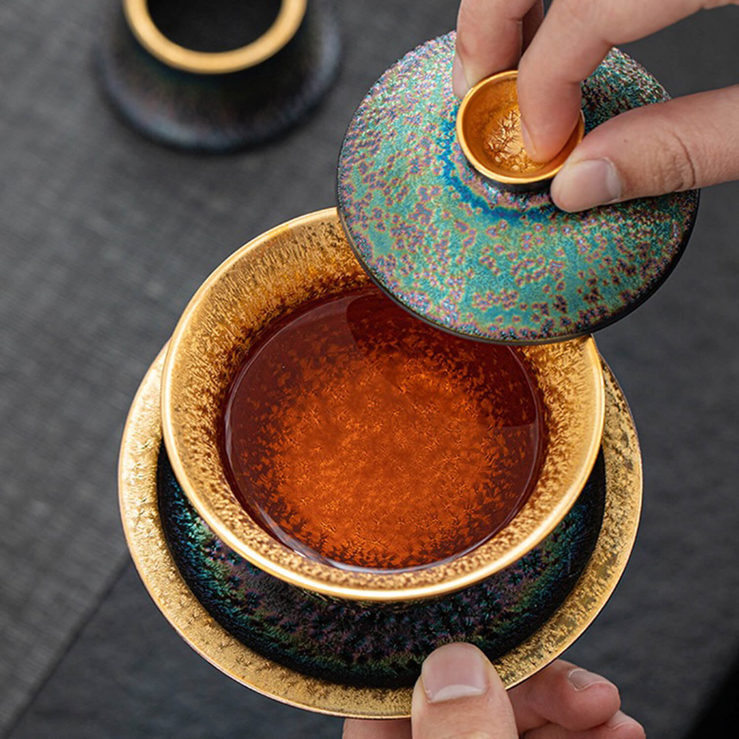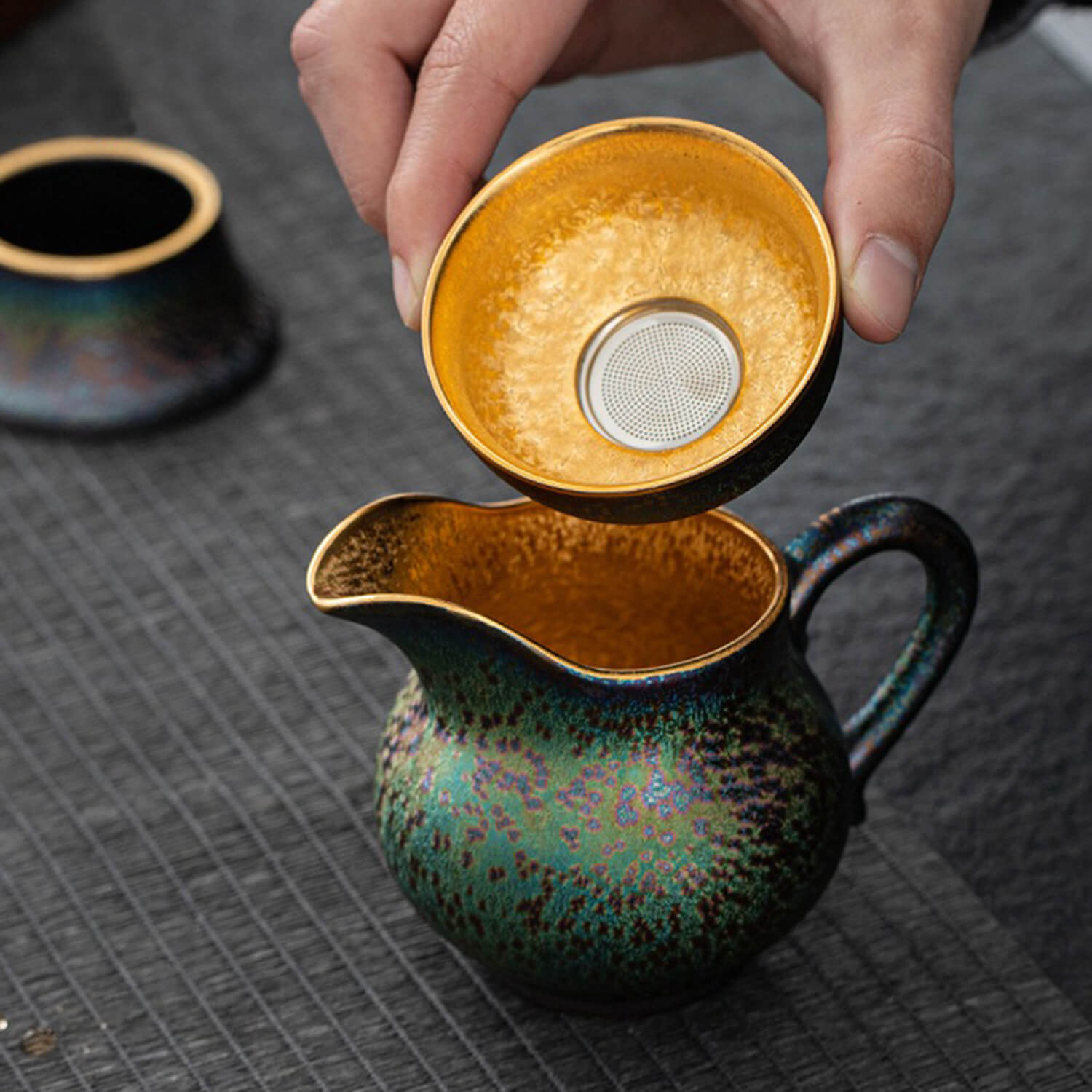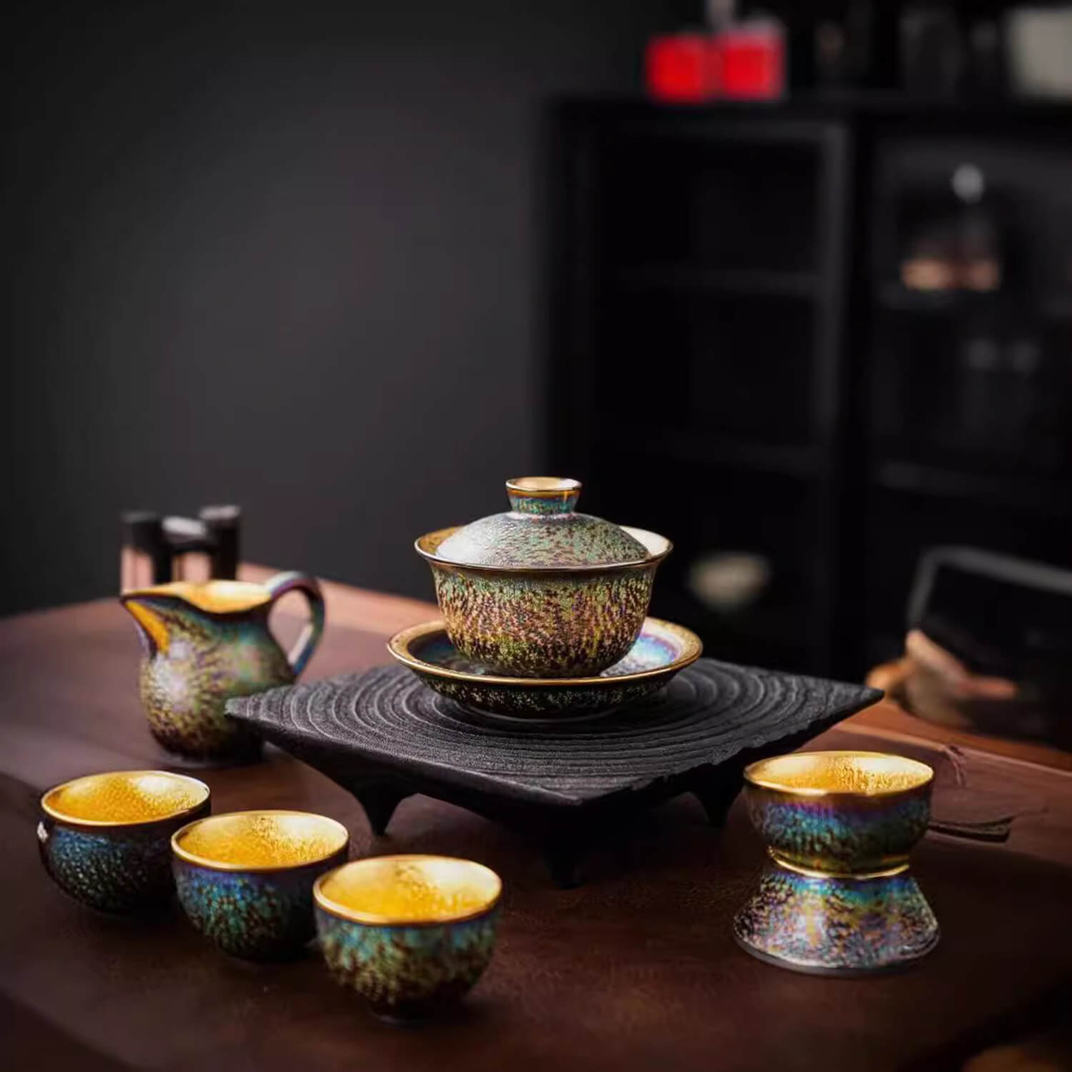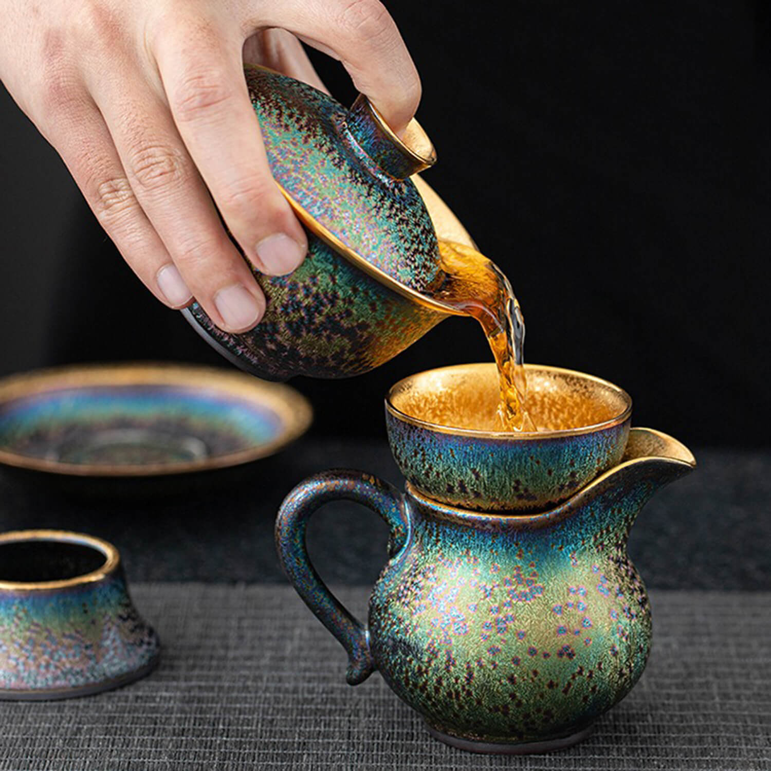 Each piece in the set, crafted from the finest kaolin porcelain, lined with 24-karat gold, and finished with a distinctive crystalline Peacock glaze inspired by the majestic Mount Gongga at sunrise, a majestic mountain range wearing a golden robe as the sun rises. This complete set brings the entire mountain experience to your tea ritual. The thick and unique Peacock Glaze resembles the rocks, forests, and lakes at the foot of the snow mountain under the sunshine.