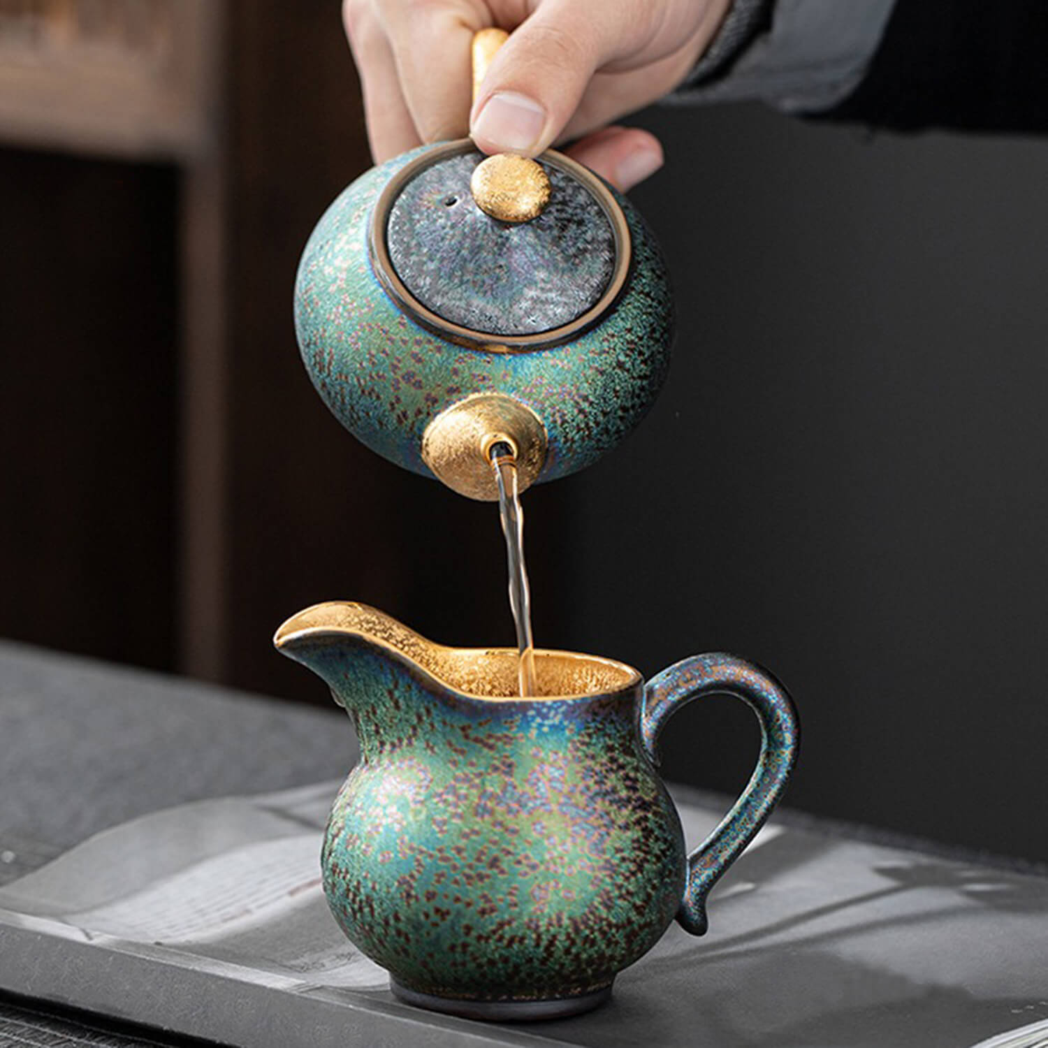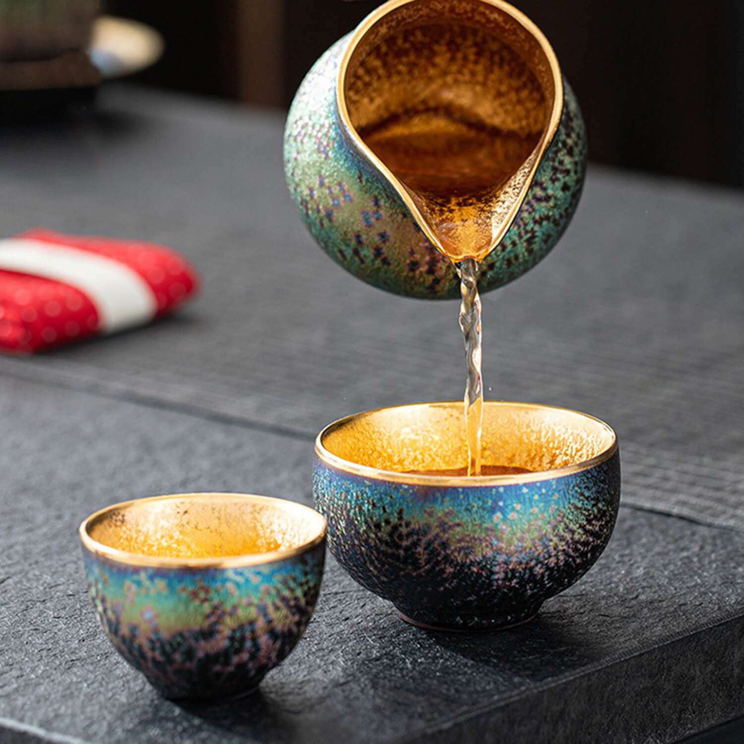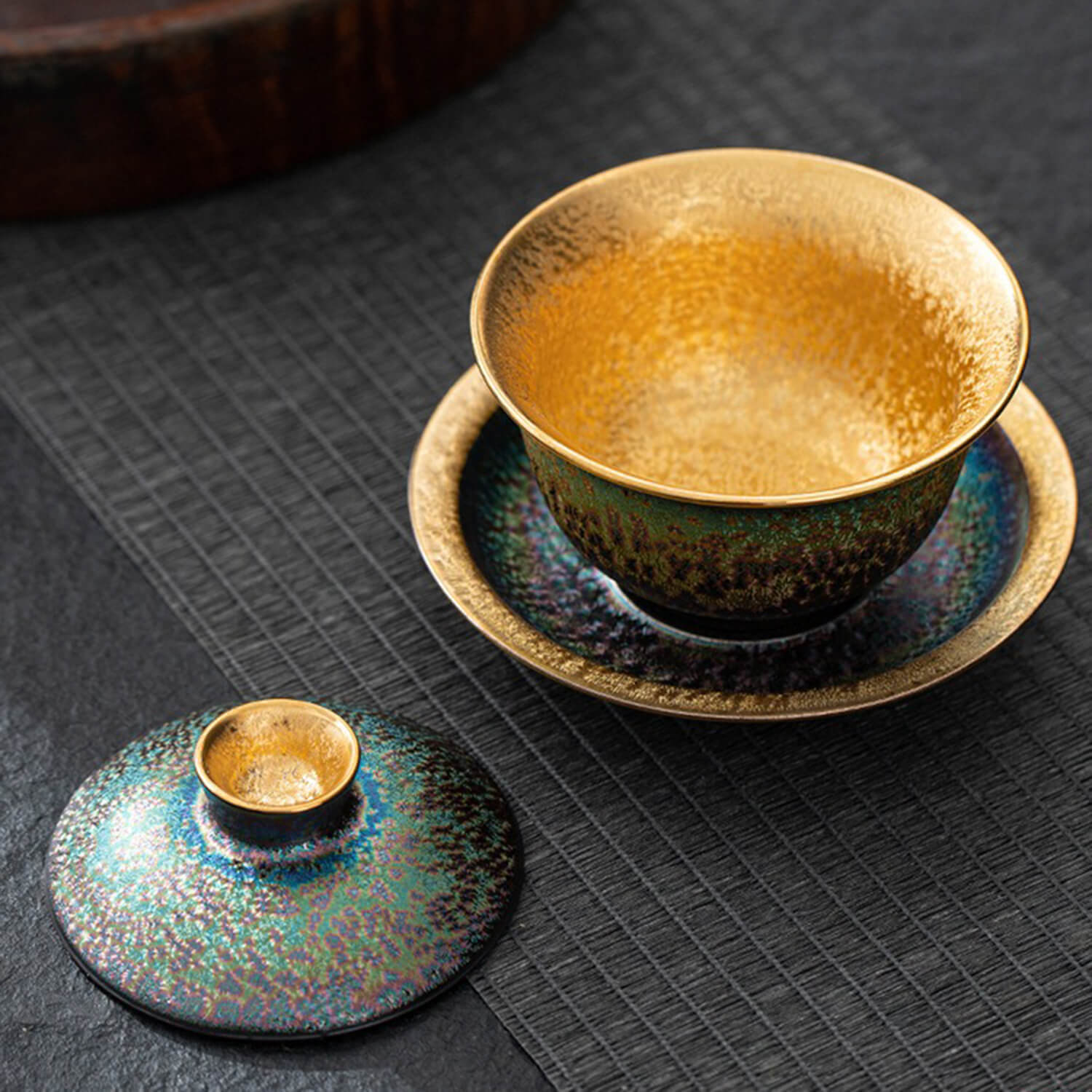 Each piece in the set, crafted from the finest kaolin porcelain, lined with 24-karat gold, and finished with a distinctive crystalline Peacock glaze inspired by the majestic Mount Gongga at sunrise, a majestic mountain range wearing a golden robe as the sun rises. This complete set brings the entire mountain experience to your tea ritual. The thick and unique Peacock Glaze resembles the rocks, forests, and lakes at the foot of the snow mountain under the sunshine.