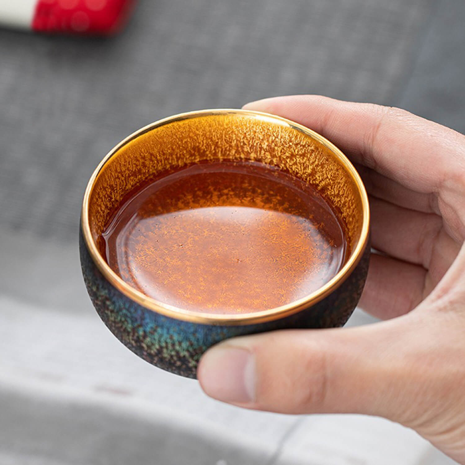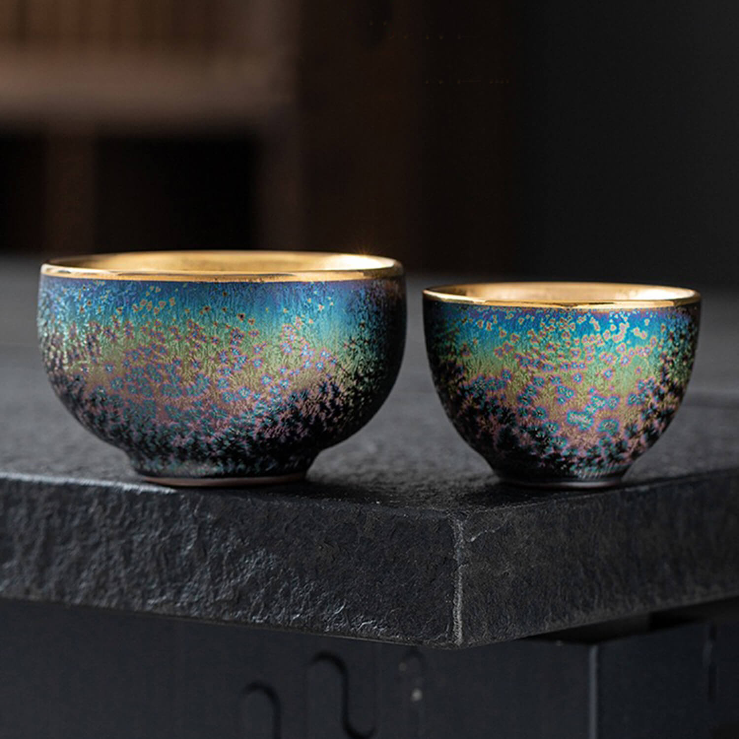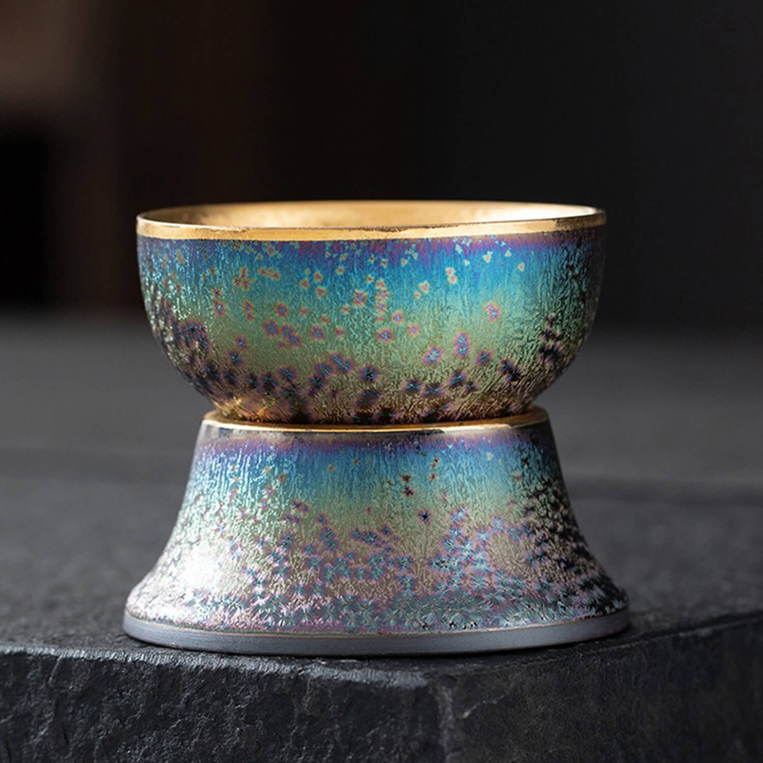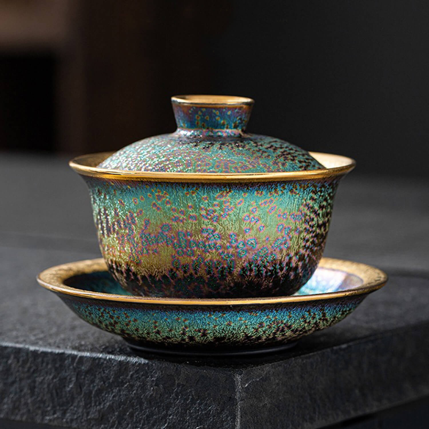 Each piece in the set, crafted from the finest kaolin porcelain, lined with 24-karat gold, and finished with a distinctive crystalline Peacock glaze inspired by the majestic Mount Gongga at sunrise, a majestic mountain range wearing a golden robe as the sun rises. This complete set brings the entire mountain experience to your tea ritual. The thick and unique Peacock Glaze resembles the rocks, forests, and lakes at the foot of the snow mountain under the sunshine.