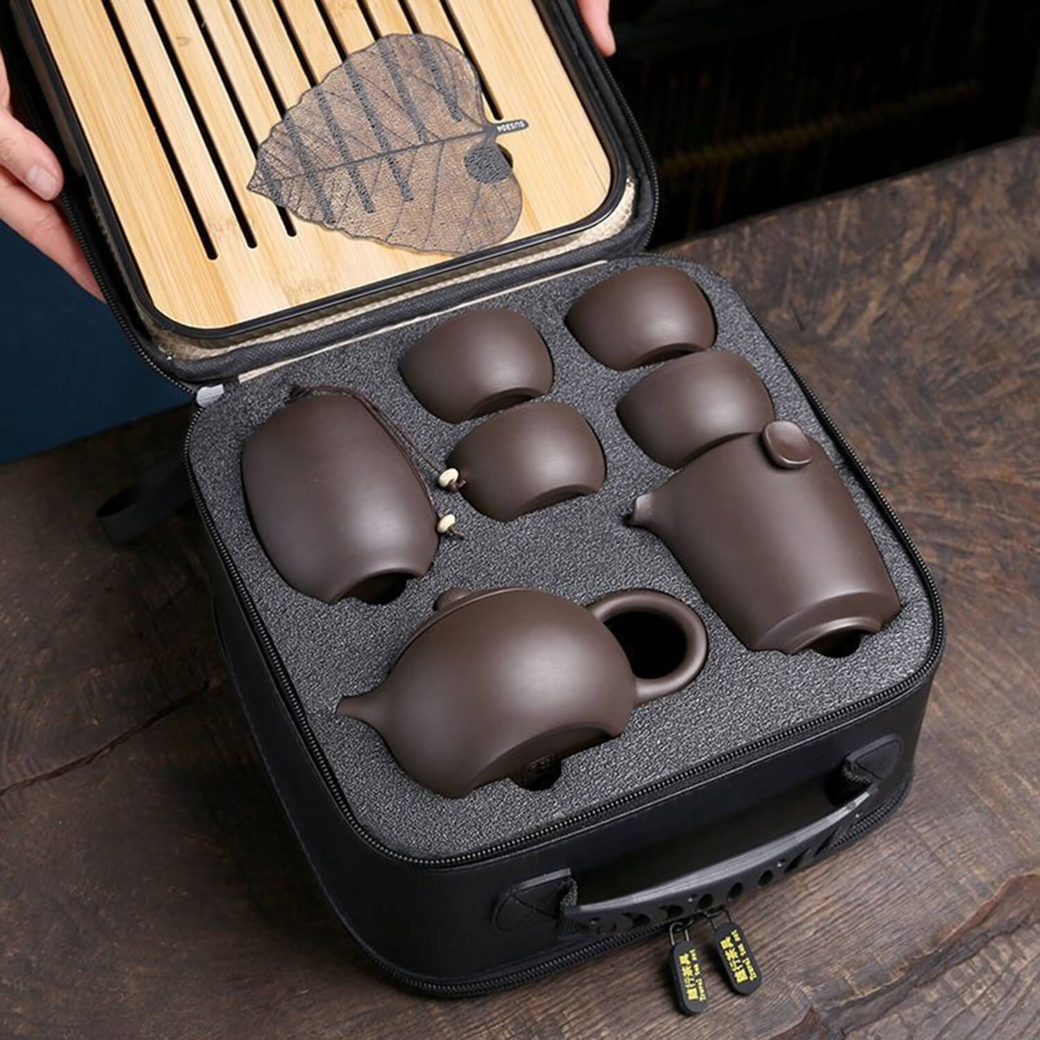The Yixing clay travel tea set embodies a balance of simplicity and sophistication, catering to tea lovers who value quality and style. Its minimalist design and refined texture make it a versatile choice for various occasions, from personal enjoyment to professional settings.