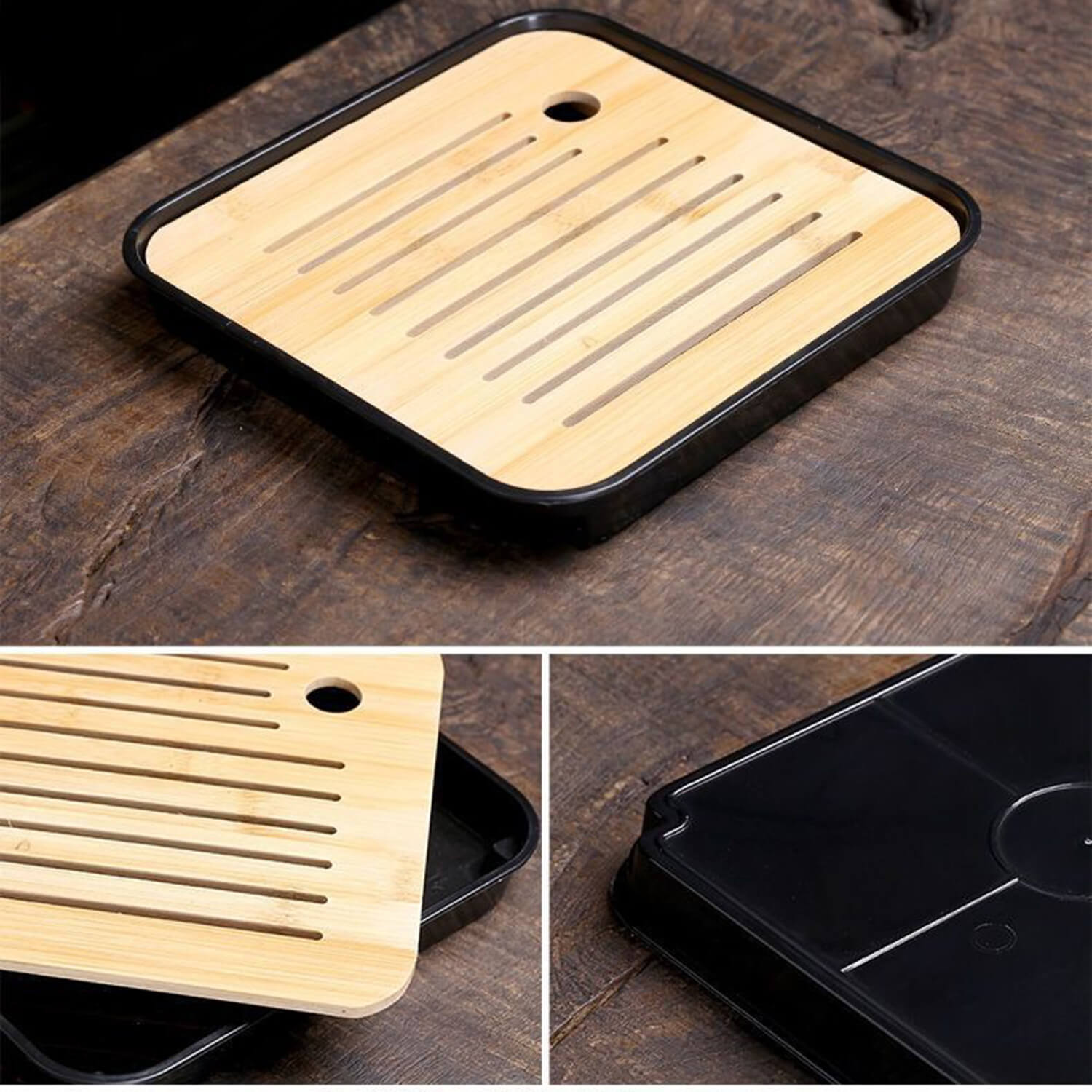 Innovative Bamboo Tea Tray: A portable bamboo tea tray with a black plastic base captures the essence of traditional tea service in a convenient form.